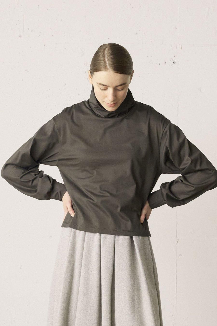 レイヤードのポイントになるボリューム袖のハイネックカットソー。