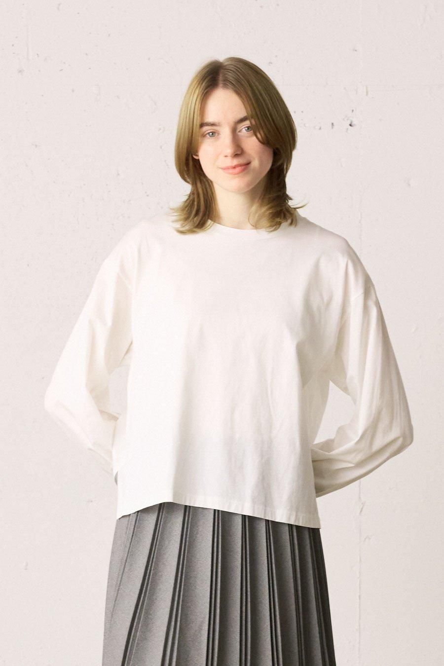 キレイめ目面の60天竺を使用した、ギャザースリーブトップス。