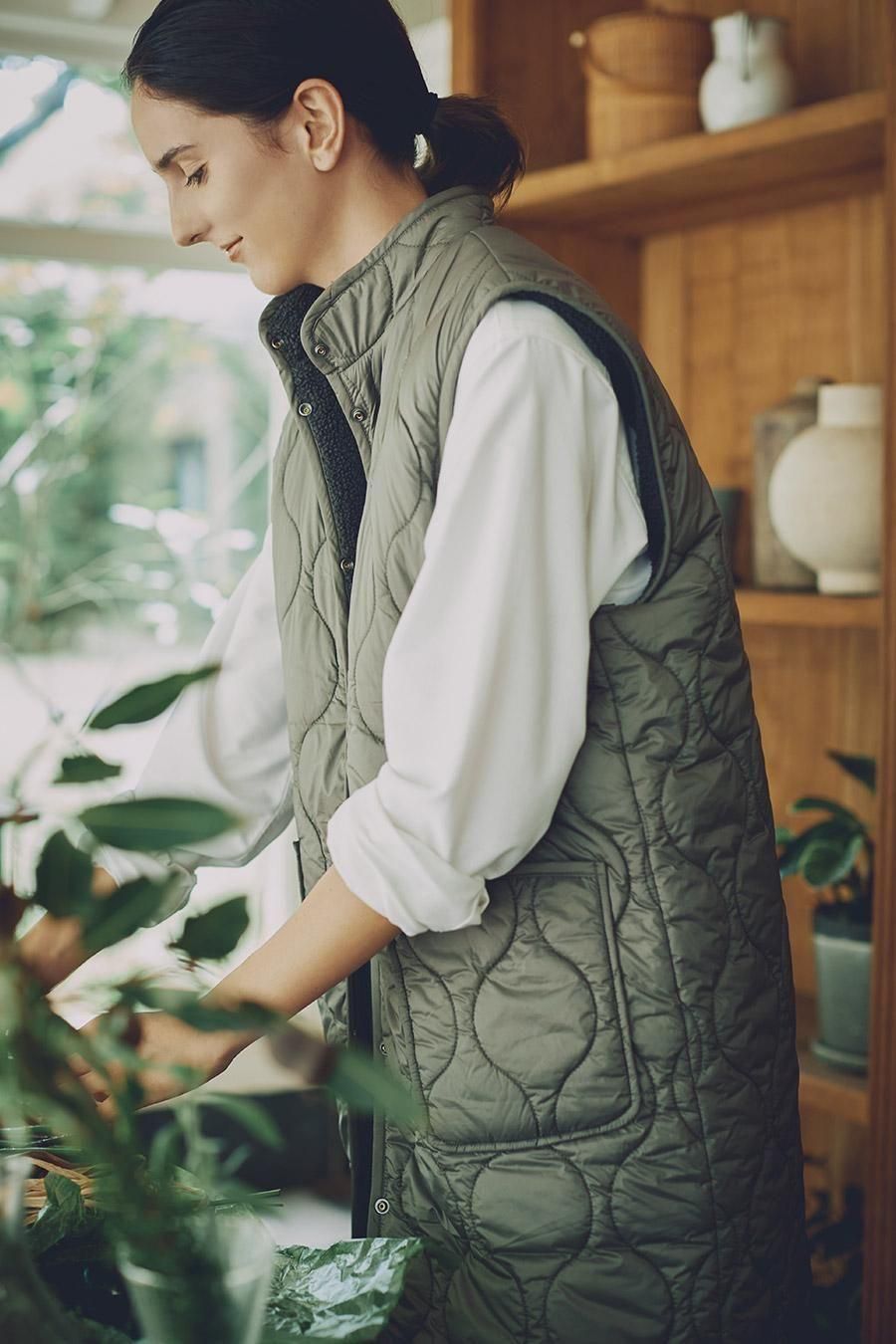 表側はすっきりとした印象のキルティング、裏側は柔らかなボア素材を使用したリバーシブル仕様。