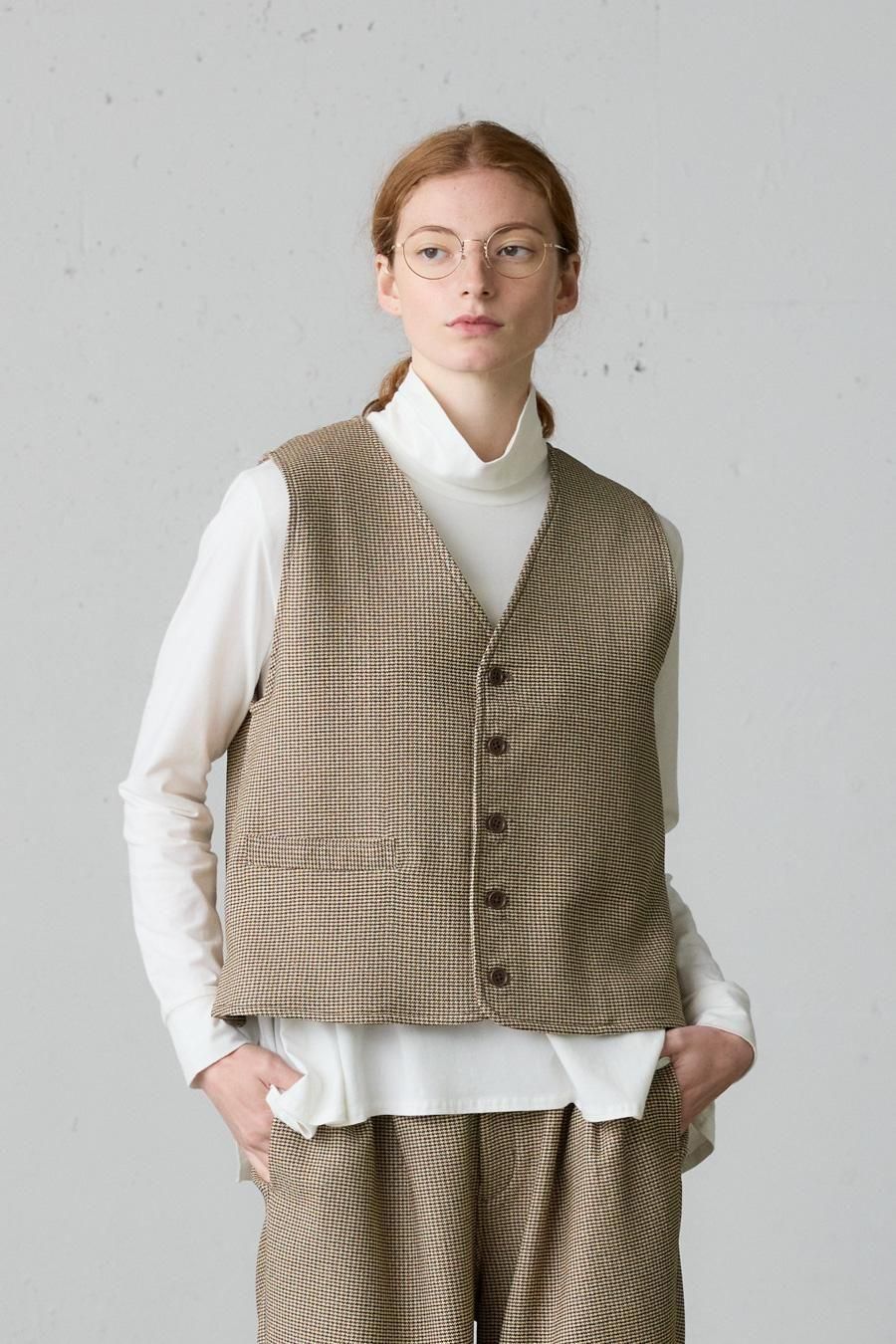 シャークスキン調のT/R素材を使用した、ブリティッシュテイスト漂うVネックベスト。